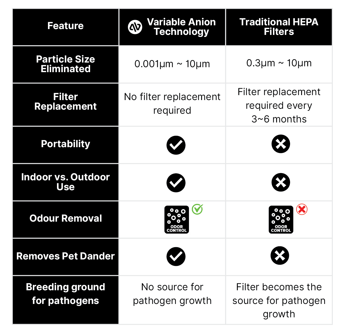 Here’s a comparison between traditional HEPA filters and Atovio’s Advanced Variable Anion Technology: